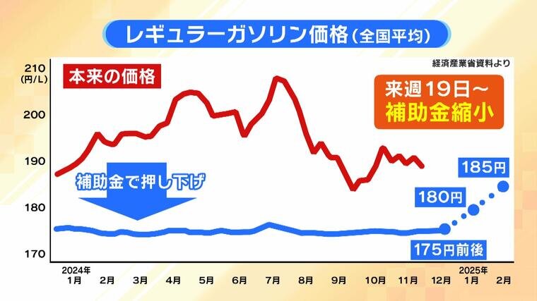 現在も値上がりを続けるガソリン価格が、12月19日から政府の補助金は段階的に縮小され、さらに値上がりしそうです。一方で、自民・公明・国民民主の三党が12月11日に、ガソリン税に上乗せされている“暫定税率を廃止する”ことで合意している為に、価格が大きく下がる可能性も出ていますので、今後のガソリン価格の行方が気になります。