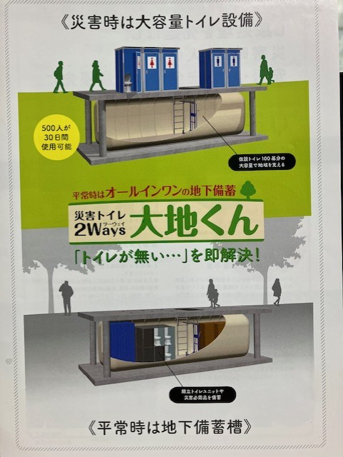 今回展示されていたトイレは、平常時は地下のタンク内にトイレを備蓄しておくタイプです。災害時は、地下からトイレを取り出して設置するだけで、500人が30日間使用可能になる画期的なものです。設置時間は2時間とのこと。現在、高知県では南海トラフ地震に備え、避難所となる小学校などの校庭に設置されています。