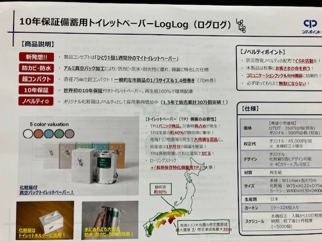 また、トイレットペーパーをアルミ真空パック加工したもの。一般のものに比べて1/3サイズで1.4倍の70mの長さという製品で、ひとり1個で1週間分という優れものです。何よりコンパクトで、パッケージもおスマートなので持ち歩きにも抵抗がなく、5年間保存できます。これであれば防災バッグに入れても場所を取らず、避難所でマイペーパーとして重宝します。