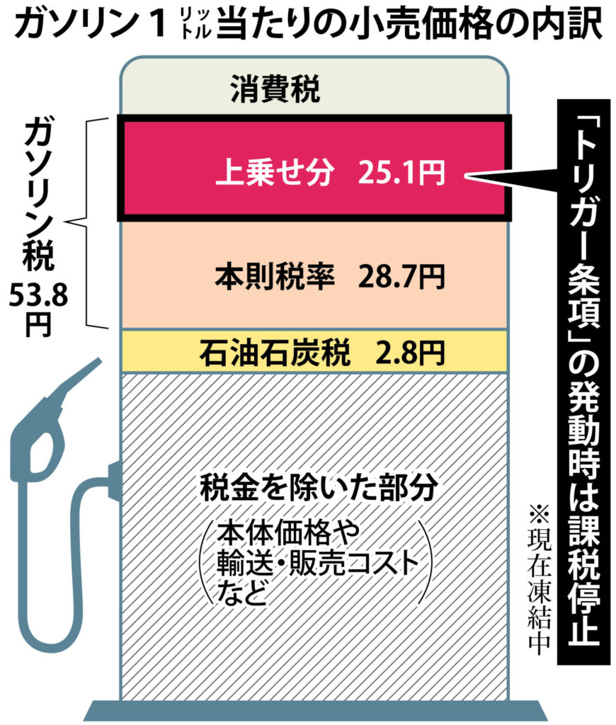 トリガー条項は、レギュラーガソリンの全国平均小売価格が3カ月連続で1リットル当たり160円を超えた場合、価格に上乗せされるガソリン税53.8円のうち上乗せ分25.1円を免除する制度です。現在は東日本大震災の復興財源を確保するためという理由で凍結したままです。国民民主党は“凍結を解除”してガソリン代金を下げるという政策を提言しています。